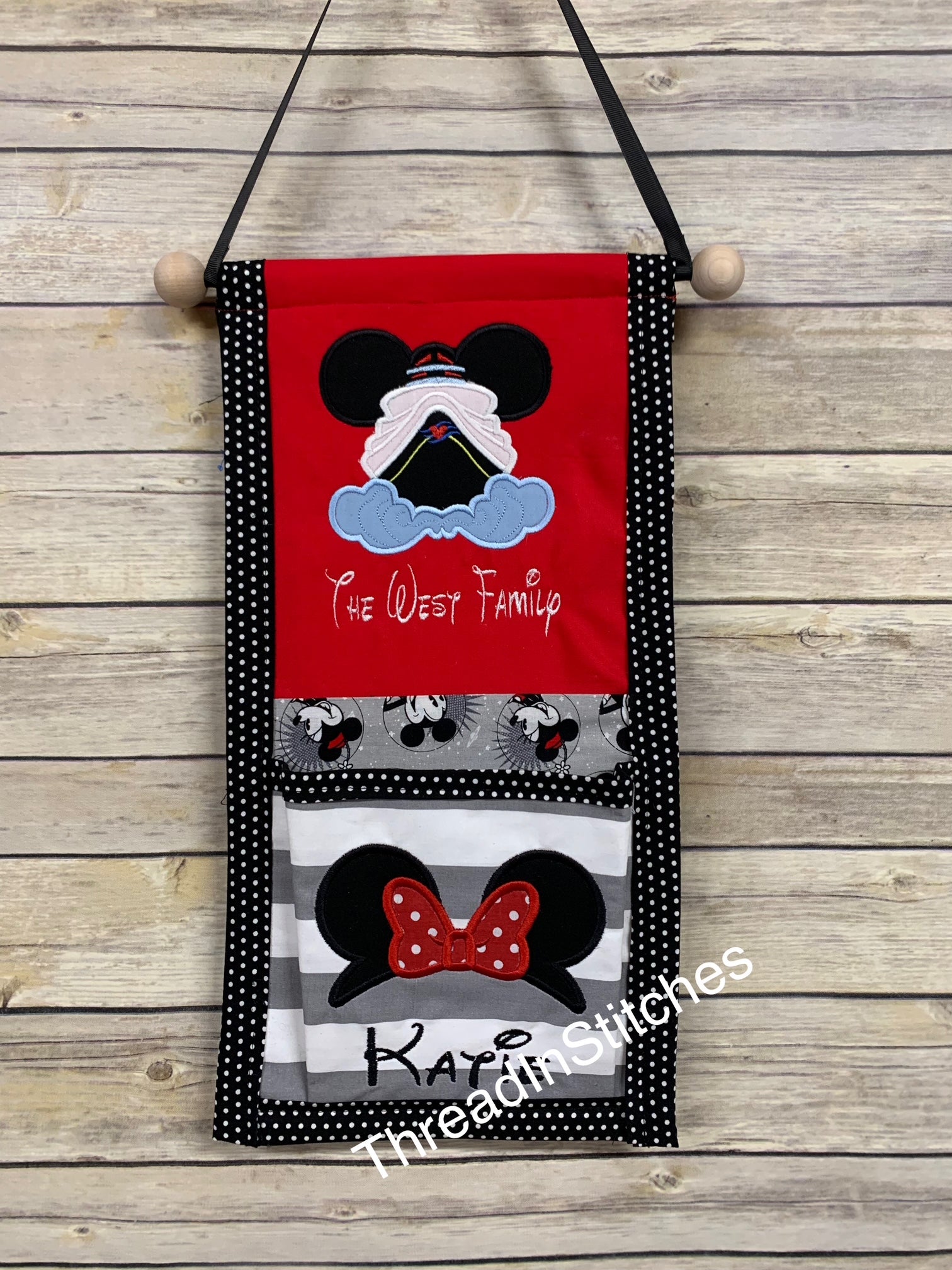 It comes with the regular wooden rod, end caps and ribbon to hang it with. OR you can upgrade to the Mickey dowel.